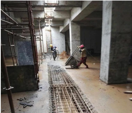 膨胀加强带作为应力释放的关键构造,施工时需精准定位与细致处理。其布置遵循“应力集中区优先”原则,沿结构长度方向每 40-60 米设置一道(具体间距根据有限元分析结果调整),避开梁柱节点等钢筋密集区,平行于短边轴线垂直布置,确保应力沿长度方向均匀释放(如图 1 所示)。两侧模板采用密目钢丝网( 5mm×5mm 孔径)与快易收口网组合支设,钢丝网阻挡粗骨料通过,收口网则形成毛糙界面,便于后期混凝土结合。浇筑顺序严格遵循“先两侧、后加强带、再连续”的流程,先浇筑加强带一侧的补偿收缩混凝土,振捣至距加强带边缘 50cm 处暂停,随即切换高掺量膨胀混凝土(膨胀剂掺量提高 0.5%-1% ,强度等级比两侧高一级,如 C35 结构段采用C40 加强带混凝土),从加强带中间向两侧浇筑,振捣时避免触碰钢丝网,确保带内混凝土密实且不混入两侧低掺量混凝土[4]。待加强带混凝土初凝前(约 2 小时内),继续浇筑另一侧混凝土,实现全截面连续成型,消除传统后浇带的时间间隔隐患。