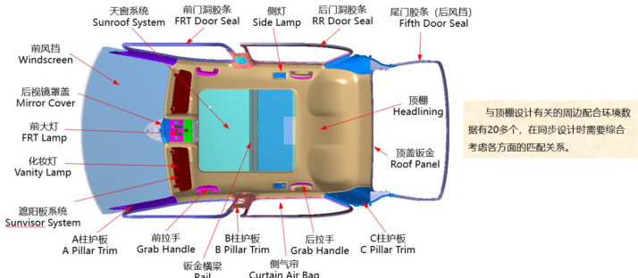 汽车内饰件装配结构复杂,以顶棚总成为例,其由顶棚本体、ABC 立柱护板、前后灯、遮阳板、密封条等多个零部件组成,各部件间通过卡扣、螺栓等方式连接,形成相互关联的尺寸链。关键尺寸链的传递路径贯穿整个装配过程,如顶棚本体与车身的安装定位尺寸会影响后续各部件的装配位置,立柱护板、前后灯与顶棚本体的配合间隙尺寸链则直接关系到外观质量和功能实现。