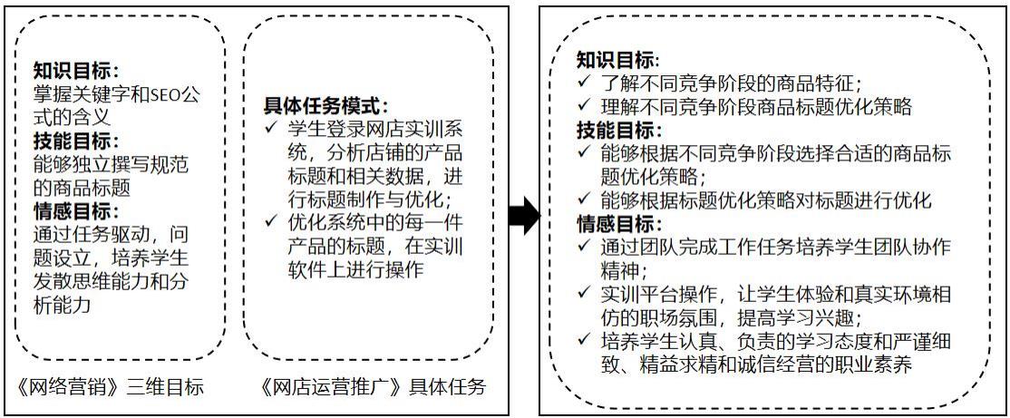 具体以《商品标题优化》课例中教学目标为例,将《网络营销》与 1+X 《网店运营推广》的教学目标融合,具体如下:
