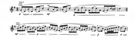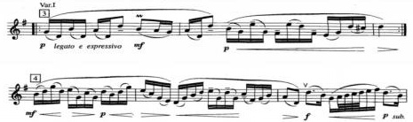 乐曲的变奏一(谱例2)中也出现了大量连音的使用,主题隐伏在十六分音符的分解和弦中,营造出一种愉悦的音乐形象。演奏这段旋律时要求在保持主题旋律的骨干音的基础上进行连音吹奏,以保证主题与伴奏音型的清晰分明。这一变奏出现较多的六度连音,如若练习不得当很容易出错。在吹奏六度甚至跨度更大的连音时,很容易忽视的问题是吹奏低音时嘴唇过于放松,导致低音区风口过大(上下嘴唇间隙)直接影响上方音高音的吹奏,而高音区吹奏需要嘴唇闭合风口,以便气息流速加快,这时由于吹奏低音区时风口过大不利于风口快速闭合,从而影响高音区吹奏质量,也影响了曲子的完整性。