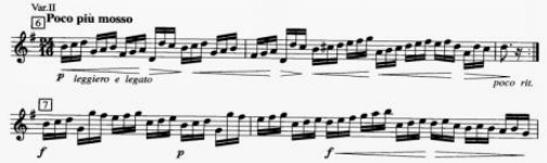 这是全曲最快的的一个变奏,速度是一个很快的快板,每分钟拍数大约在132 以上,是考验演奏者手指灵活度的困难片段,解决这些问题的最好的办法就是将它分解开逐步消化练习。映射到我们日常练习中,应多练习音阶与琶音,先从慢练开始,要求每一个音符都要饱满有力吐音清晰,然后逐步加速。