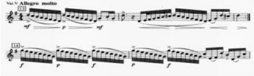 作品的变奏五(谱例 5)是乐曲的高潮部分,该变奏运用三十二分音符的音阶上下进行,勾勒出一条波浪式的旋律线,大量运用力度的强弱变化来表现活跃的气氛,最后在欢快的气氛中结束。高密度的音符和较快的速度,无疑给演奏者带来很大的挑战。多数人在演奏这段旋律时过于注重速度而忽视了每一个音的饱满程度,导致吹出的音模糊不清,这是不可取的,也是一种无效的练习。笔者认为应该从慢速练习,在保证吹奏质量的情况下提速,循序渐进的练习才是最科学有效的方法。