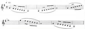 这项练习要求应尽量缩小口型的变化,打开口腔,在吹完一条完整练习之前不要将号嘴移开嘴唇,这样做的目的是为了防止变换口型,影响练习效果。切记不要停止气息的运动,用气息连接每一个音,尽量做到是旋律线平滑。