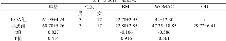 2023 年 4 月至2024 年 8 月,在中医药大学附属第三人民医院及医院周边社区,招募并筛选出符合纳排标准的,双侧KOA合并NLBP者20 例(共患组),双侧KOA未合并NBLP者 20 例(对照组)。两组受试者年龄、性别、体质指数(Body Mass Index, BMI)、西安大略和麦克马斯特大学骨关节炎指数(Western Ontario and MeMaster Universities Osteoarthritis Index, WOMAC)得分差异不显著,两组具有可比性,见表 1。共患组Oswestry功能障碍指数(Oswestry disability index,ODI)得分为 29.72±6.41。