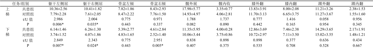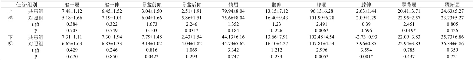 上梯过程中,共患组骨盆后倾角度、膝屈曲角度、踝背屈角度小于对照组;下梯过程中,共患组骨盆前倾角度、膝屈曲角度、膝伸直角度小于对照组。两组躯干屈伸及髋屈伸角度没有显著差异,见表2。