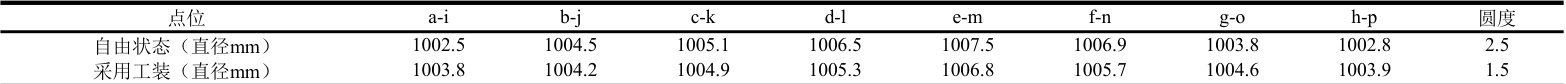 针对该产品结构特性,首先采用了防变形工装优化方案。在水道筋焊接前,在内水套筒内安装防变形工装,在水套上中下三个截面安装防变形工装,防变形工装的结构见图 1,该工装采用钢板进行拼接,中间为正 8 边型,四周焊接 8 块钢板,防变形工装与水套接触部位同样采用焊接方法进行连接。使用该防变形工装制作水套后对水套内圆圆度进行测量,在水套径向方向均匀取 8 点(见图 2),测量数值见表 1,工艺验证表明,该方案使焊接后内圆圆度降至 1.5mm ,较自由状态焊接降低 40% ,但仍未满足≤1 mm的技术要求。