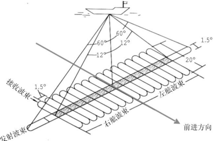 其中的自治式潜水器与无人潜水器测绘技术应用时,主要是借助专业的测绘潜水器,从而深入水下展开地形测绘,以获得详细准确的地形数据信息。侧扫声呐系统应用时,主要是借助声波对水下地形进行扫描,基于获得的数据处理分析后,可得到水下地形的二维图像。多波束测深技术主要是通过对水下地形测绘目标区域发射多条声波束,实现对水下地形的三维扫描,可获得高精度的水下地形数据,如下图 1 所示,为多波束测深技术的应用原理示意。