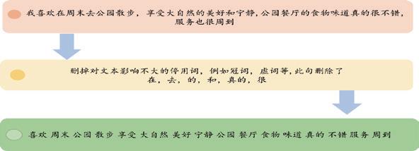 首先进行文本预处理工作 , 停用词筛选 [1]: 原句为:“我喜欢在周末去公园散步,享受大自然的美好和宁静 ,公园餐厅的食物味道真的很不错,服务也很周到。”假设第一次传抄后为:“我喜欢在周末去公园散步,享受大自然的美好和宁静 , 公园餐厅的食物味道真的很不错,服务也很周到”。首先将两个文本进行预处理,将文本转化为一长串字符串的形式,再利用 Python 编程将两文本的的停用词删掉 , 具体删除的数据见下图。