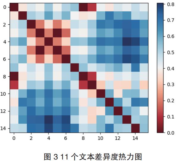 也就是矩阵对应的第 i 行,第 j 个文本,也就是矩阵对应的第 j 列,第 i 行 j 列的“格子”里的数值,就是 i 文本与 j 文本的余弦相似度,用 1 减去余弦相似度矩阵的每一个值,就得到了差异度量矩阵,设为 D 矩阵。我们再用热力图来更直观得观察到这 11 个文本之间的差异度矩阵。