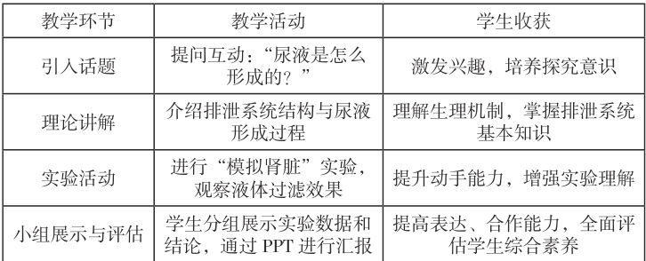 生物学学习需要大量实验及实践活动支撑。在 “人体内废物的排出” 这一课题中,教师可设计简便易行的实验,让学生亲身探究排泄过程的相关知识 [2]。例如:学生可通过模拟肾脏结构,掌握尿液形成的原理。这样的实验活动既能帮助学生深入理解生物学知识,也能提升其实际操作能力与解决现实问题的能力。通过活动开展,学生可将课堂知识与实际生活结合,形成深刻且持久的知识认知。