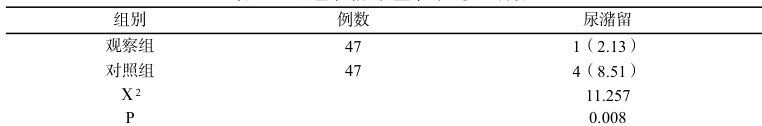 表 1 两组尿潴留发生率的比较 n (%) )