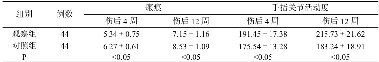 创面愈合4 周、12 周,观察组瘢痕评分显著低于对照组,手指关节总活动度评分显著高于对照组,有统计学意义( P<0.05 ),详见表