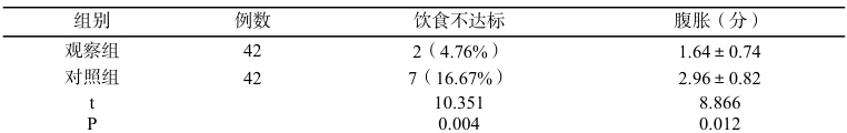 1.4 统计学方法:数据分析采用SPSS25.0 统计学软件,两组腹胀评分的比较采用 t 检验,饮食量不达标率的比较采用卡方检验,以 P<0.05 认为差异有统计学意义。
