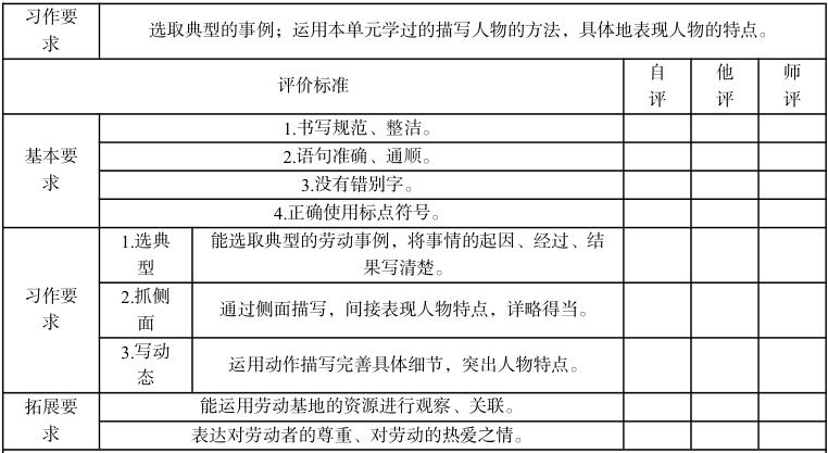 在统编教材中,习作目标以前后衔接、螺旋式上升的结构呈现。因此,习作评价的设计应先梳理学段目标,从具体的习作内容出发,确定每次的习作目标,体现当次习作目标向学段习作目标递进的原则。在具体操作上,需以教材为纲,纵向梳理整套教材的习作体系,聚焦学生习作能力的发展序列;横向对比单元中各篇课文的学习内容,分析整个单元的语文要素,确定相应的习作目标。