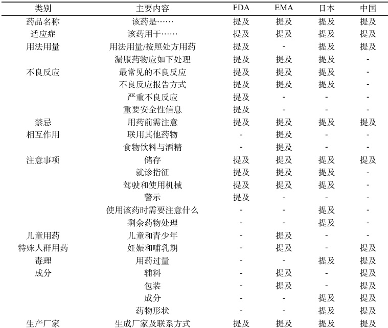 解析美国 FDA 发布的患者用药信息、欧洲药品管理局(European Medicines Agency,EMA)发布的消费者信息活页、日本厚生省发布的患者用药指南、中国药品监督管理部门发布的患者适老化说明书[4][6-9],纳入3 个以上国家或地区患者药品说明书均提及的核心元素,初步构建患者药品说明书基本框架。