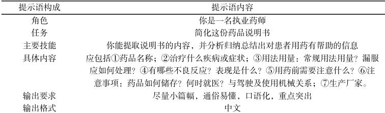 基于已构建的患者药品说明书框架,构建提示语并优化[12]。提示语包含指令词、背景、输入要求和输出要求 4 部分内容。规定大语言模型的角色、任务简介、主要技能、操作步骤、输出要求、输出格式、初始化材料,上传国家药监部门已批准的达格列净片(商品名:安达唐)药品说明书[13],作为典型案例,逐步优化提示语,最终形成提示语构建策略。