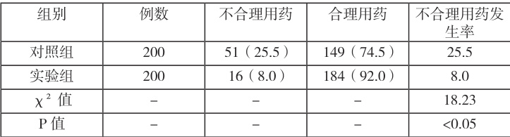 对照组不合理用药发生率为 25.5% ,实验组不合理用药发生率为 8.0%,实验组不合理用药发生率显著低于对照组,差异具有统计学意义(P[0.05)。具体数据见表 1。