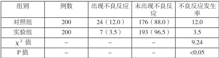 2.2 两组患者不良反应发生率比较对照组不良反应发生率为 12.0% ,实验组不良反应发生率为 3.5% ,实验组不良反应发生率明显低于对照组,差异具有统计学意义 (P[0.05) 。具体数据见表 2。