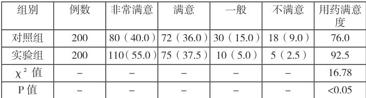 对照组用药满意度为 76.0% ,实验组用药满意度为 92.5% ,实验组用药满意度显著高于对照组,差异具有统计学意义(P[0.05)。具体数据见表 3。