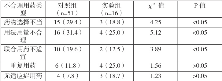 对照组中,药物选择不当、用法用量不合理、联合用药不适宜、重复用药、无适应症用药的构成比分别为29.4% 、 31.4% 、 19.6% 、 11.8% 、 7.8% ;实验组中,上述类型的构成比分别为 18.8% 、 25.0% 、 12.5% 、 25.0% 、18.7%∘ 。两组不合理用药类型分布存在一定差异,其中药物选择不当、用法用量不合理、联合用药不适宜在对照组中的构成比高于实验组,差异具有统计学意义(P[0.05);重复用药、无适应症用药在两组中的构成比差异无统计学意义(P]0.05)。具体数据见表 4。