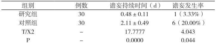2.1 谵妄发生率及持续时间:研究组优于对照组( P<0.05 ),详见表1。