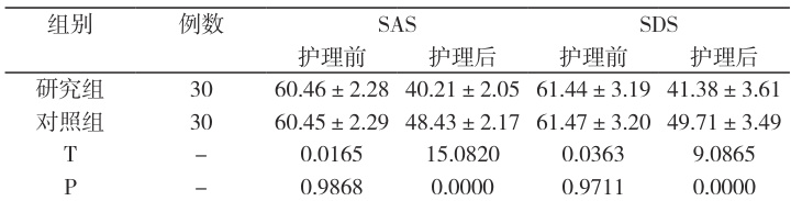 2.2 心理状态:护理前, P>0.05 ;护理后,研究组评分更低( P<0.05 )。详见表2。