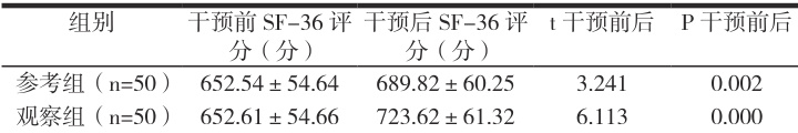 如表 2 :干预前 SF-36 评分无差异( P>0.05 );干预后分数均有所升高,且观察组分数较大,有差异( P<0.05 )。