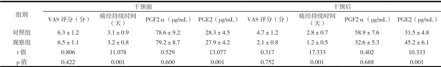 干预前两组 VAS 评分、痛经持续时间及前列腺素水平差异无统计学意义( P>0.05 );干预后观察组各项指标均显著优于对照组( P<0.05 ),且观察组组内改善幅度大于对照组( P<0.05 )。详见表1。