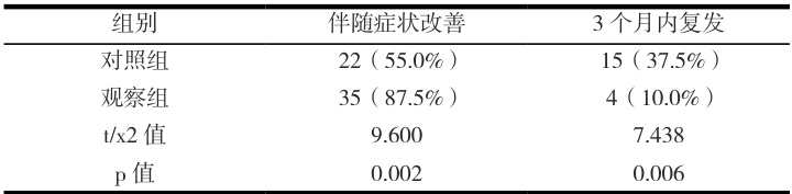 干预后观察组伴随症状改善率显著高于对照组,3 个月复发率显著低于对照组( P<0.05 )。详见表2。