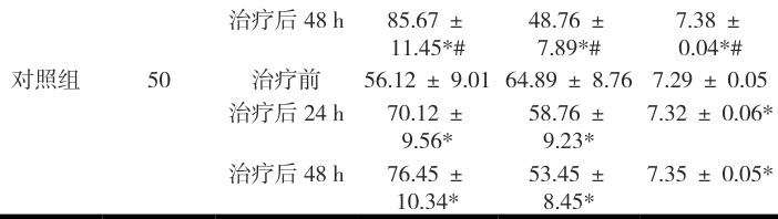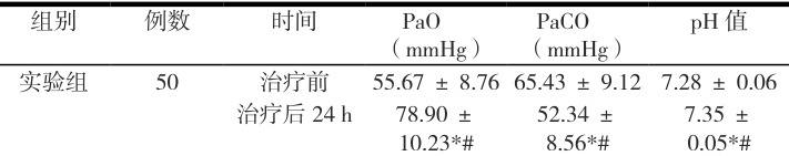 两组患者的 PaO2 、 PaCO2 、 pH 值在治疗前比较,差异无统计学意义( P> 0.05)。治疗后 24h 、 48h ,两组患者的 PaO2 均较治疗前显著升高( P<0.001 ),PaCO2 均较治疗前显著降低( P<0.001 ), pH 值均较治疗前显著升高( P<0.05 ),且实验组患者的 PaO2 升高更明显( P<0.05 ), PaCO2 降低更明显( P<0.05 ),pH 值改善更明显( P<0.05 )。见表 2