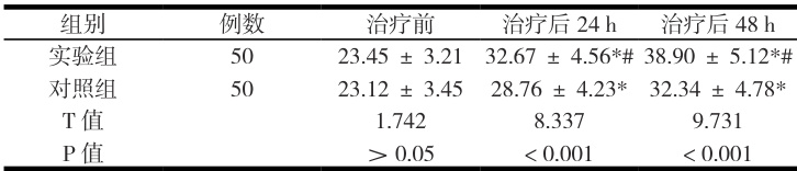两组患者的肺顺应性在治疗前比较,差异无统计学意义( P>0.05 )。治疗后 24h 、 48h ,两组患者的肺顺应性均较治疗前显著升高( P<0.001 ),且实验组患者的肺顺应性显著高于对照组( P<0.001 )。见表1。