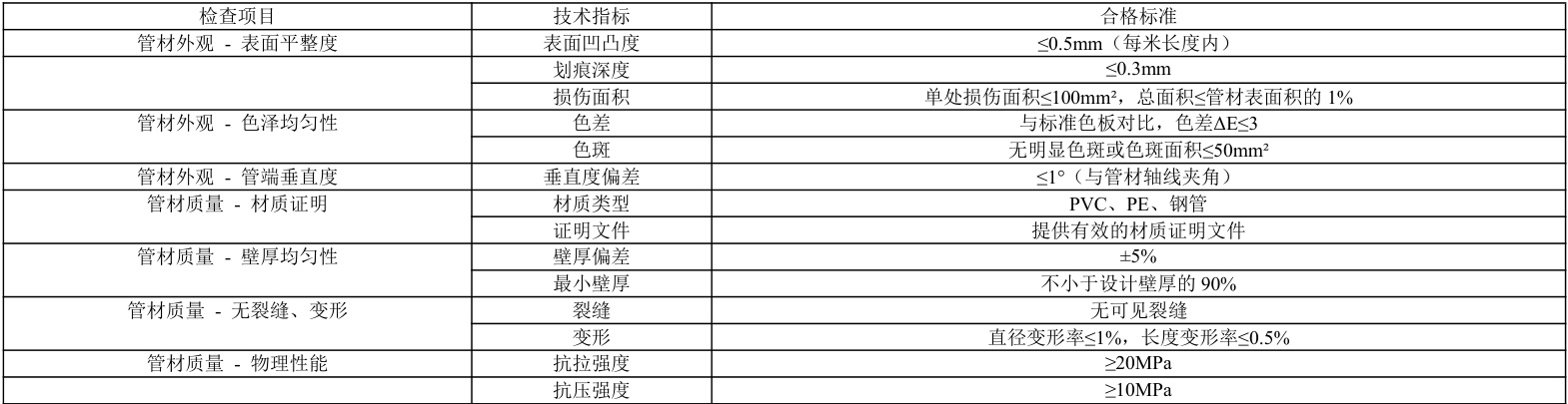 表 1 管道质量要求