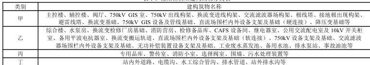 根 据 《 湿 陷 性 黄 土 地 区 建 筑 标 准 》 GB 50 0 2 5 -2 0 1 8 和 《 变 电 站 建 筑 结 构 技 术 规 定 》 DL _ T 54 5 7 - 2 0 1 2 以 及 《 换 流 站 建 筑 结 构设计技术规程》DL / T 54 5 9 -2 0 1 2 的规定,对于建在湿陷性黄土场地上的建构筑物,应根据其重要性,地基受水浸湿可能性的大小和在使用期间对不均匀沉降限制的严格程度[2 ] ,分为甲、乙、丙、丁四类,具体分类见表 1-1 。