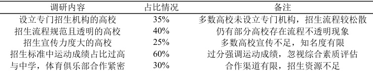 仅有 35% 的高校设立了专门的招生机构,多数高校招生流程松散,缺乏规范性和透明度。招生宣传力度普遍不足,导致高校知名度有限,难以吸引更多优秀运动员。 60% 的高校在招生标准中过分强调运动成绩,忽视了运动员的综合素质和潜力评估。