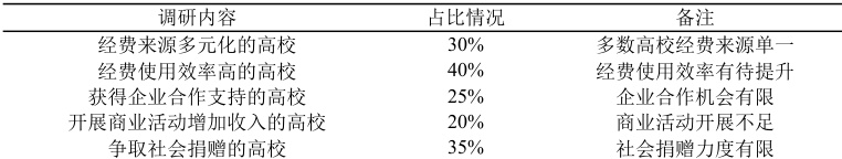 仅有 30% 的高校经费来源多元化,多数高校经费来源单一,缺乏稳定的资金支持。经费使用效率有待提升,部分高校存在资源浪费和效率低下等问题。企业合作机会有限,仅有 25% 的高校获得企业合作支持。商业活动开展不足,仅有 20% 的高校通过开展商业活动增加收入。社会捐赠力度有限,仅有 35% 的高校争取到社会捐赠。