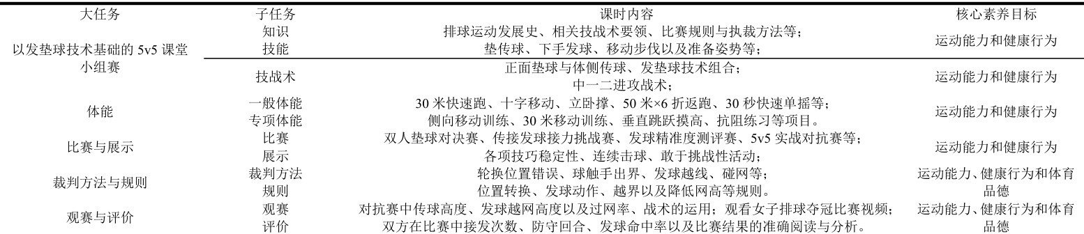 (二)初中排球大单元教学内容框架设计如下表所示: