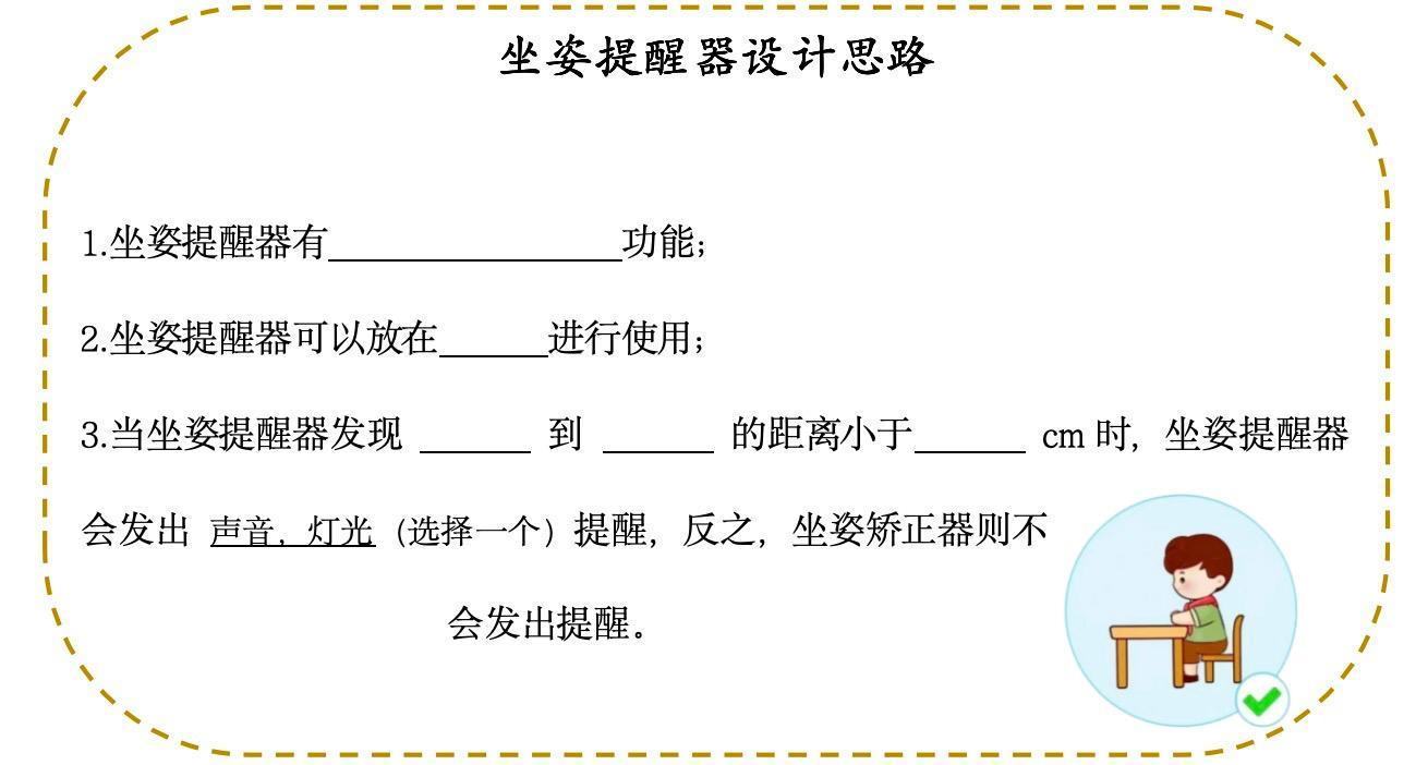 3.当坐姿提醒器发现 到 的距离小于 cm时,坐姿提醒器会发出声音,灯光(选择一个)提醒,反之,坐姿矫正器则不会发出提醒,