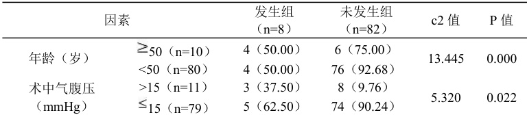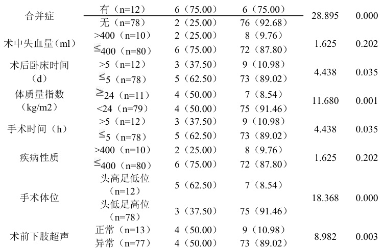 腹腔镜术后并发症的影响因素和年龄、术中气腹压、合并症、术后卧床时间、体质量指数、手术时间、疾病性质、手术体位、术前下肢超声存在统计学意义, P<0.05 ,在术中出血量方面两组患者没有较大差异, P>0.05 ,见表 2。