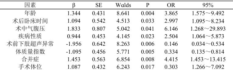 Logistic 回归分析,年龄、术后卧床时间、术中气腹压、疾病性质、术前下肢超声异常、体质量指数、合并症、手术体位为腹腔镜术后并发症的危险因素, P<0.05 ,见表 3。
