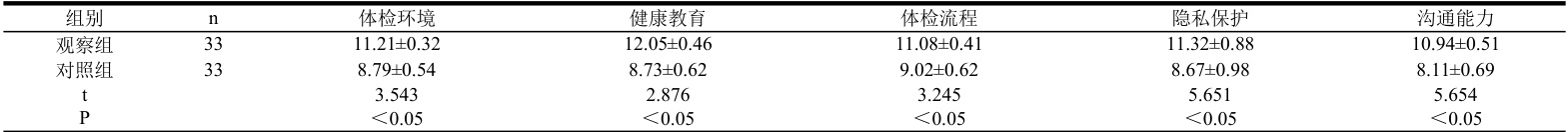 观察组实施的是人性化管理模式:(1)对护理人员进行专业化培训,不断提高护理人员的护理技能和护理水平。在护理期间,护理人员耐心地给体检者普及疾病知识,讲解体检重要性,告知体检者体检流程,提高体检者的认知,进而积极配合健康管理中心的工作。(2)制定完善的管理制度,强化对本中心的环境管理,创建文明、有序、和谐的环境条件,提升体检者的舒适度和体验感。体检前,反复核对体检者基本信息,避免出现差错。按照人性化管理流程指导体验者有序登记、排号。做好体检者情绪安抚工作,避免体检者出现焦虑情绪。待体检结束,护理人员观察体验者情况,防范风险事件的发生,最大程度上提高护理质量,提升护理服务水平。