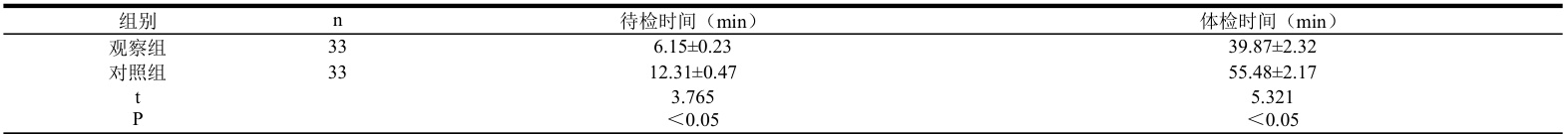管理后,观察组体检者待检时间、体检时间比对照组短,差异显著( (P<0.05) );见表 3: