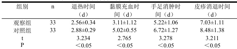 观察组进行层级链式护理:(1)按照层级划分,将护理职责落实到实处,高级护理人员负责制定护理计划方案,评估护理效果。(2)责任护士严格按照护理计划部署护理工作,并加强对护理人员临床护理操作的监督和指导,规范护理人员的护理行为,切实提升患儿的护理效果。(3)护理人员严格按照护理流程开展各项护理工作,仔细观察患儿的皮肤状态,探触皮肤温度,预防皮疹的发生。做好口腔清洁工作,预防黏膜水肿。护理期间,详细记录患儿心率、呼吸频次等循环体征指标,定时测量体温,做好退热处理。为避免患儿家属焦虑和心急,护理人员耐心地安抚患儿家属,及时解答患儿家属提出的疑问,消除家属的顾虑,减少家属焦虑情绪,从而积极配合护理工作的开展,切实稳定患儿的病情,促使患儿尽快恢复身体健康状态。