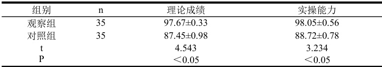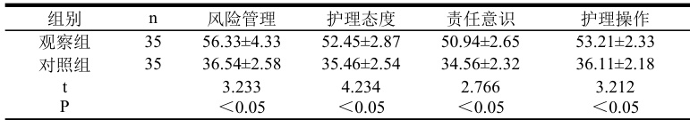 随机分组,观察组( 1=35 ),男/女 9/26,最小\~最大年龄:21\~40( 30.23±2.54 )岁。对照组35 名护理人员男性/女性:8/27,年龄 22\~41( 30.92±2.17 )岁。两组护理人员一般资料相比较,差异无统计学意义(