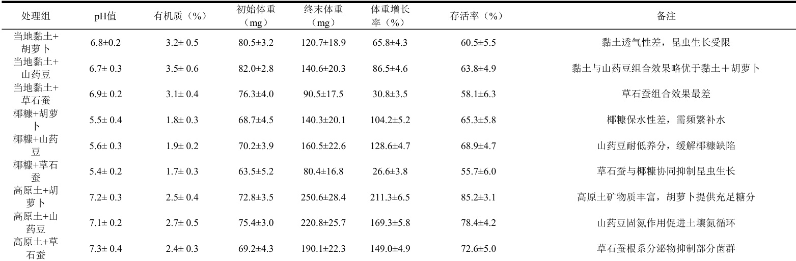 高原土组表现出最优异的综合性能:昆虫终末体重达 250.6±28.4mg ,显著高于椰糠组 (140.3±20.1mg )和黏土组( 120.7±18.9mg )( p<0.01 )。其存活率 85.2±3.1% 比黏土组高24.7 个百分点。高原土中检测到的锌、硒等微量元素含量较其他土壤高 3 倍-5 倍,这可能是促进昆虫生长发育的关键因素。