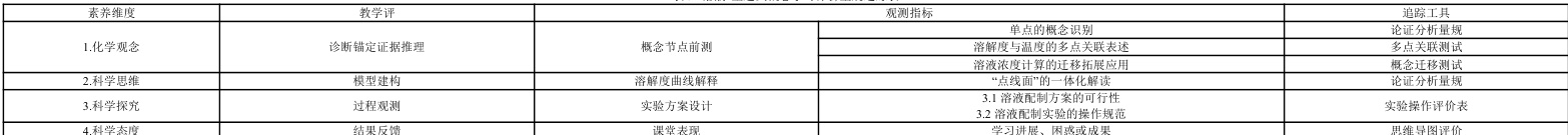 循证评价要求深化证据导向的教学改进,建立包含前测诊断、过程表现观察、结果对比的多源循证链 ,[9]促进形成评价追踪的可视化循证体系。基于“溶液”主题大单元学习的概念“全景图”,锁定前述的循证链,为全面、精准判断学生学习的薄弱项、堵卡点,验证教学策略的有效性,以及优化教学、查漏补缺或强基固本提供决策支撑,从而促进学生对“溶液”主题概念乃至整个化学学科大概念的深度理解与灵活应用。因此,基于 SOLO 分类理论构建核心素养发展评估框架,结合概念教学与素养目标追踪矩阵,针对性地设计本单元的“评价量规追踪表”(见表3),量化学生概念学习的层次。