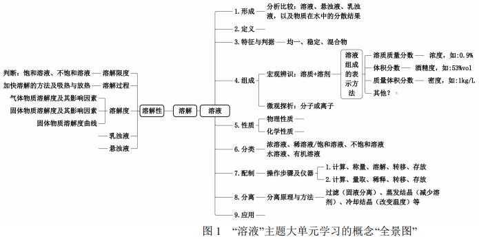 2.1 概念解构——圈定单元间的逻辑关联纽带,勾勒单元结构的框架导图“教材开发需突破二维局限,体现认知重构的立体布局”[5]。显然,在大单元学习视域下的大概念教学中,必须对现行教材的编排内容进行系统性的研读、重构和整合。如此,教材便成了引领学生深入探索学习概念与解构认知概念的珍贵资源,同时也满足了学生多样化、差异化及具象化的学习需求。例如,“溶液”主题大单元学习的概念“全景图”(见图 1)清晰地展现了纵横阡陌的主题概念图谱,其中涵盖了溶液的概念、组成、性质、分类、配制、分离及应用等18 个核心知识节点,还体现了“溶解”“溶解性”“溶解度”“溶液”等核心概念横向联结的定性比较,以及溶液组成表示的纵向辨析定量比照。