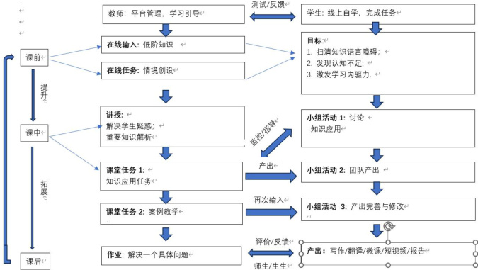 针对以上教与学的痛点,《基础英语》课程组秉承“以学生为中心”的教学理念,坚持以产出为导向,从教学模式转变,教学内容重构,教学评价拓展三个方面对本课程进行了重新设计。