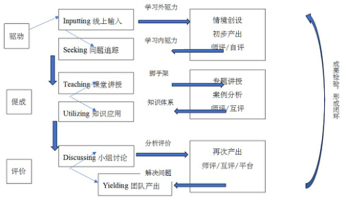 为提升学生的高阶思维能力,增强其语言应用能力,本课程组创立 “i-STUDY”混合式教学模式,由线上输入(inputting)、问题追踪(seeking)、课堂讲授(teaching)、知识应用(utilizing)、小组讨论(discussing)、团队产出 (yielding)六个步骤,完成驱动—促成—评价的全部流程,突破传统的语言基础课字、词、句、篇的刻板教学,构建学生为中心的,为学生后期深度学习和未来职业发展服务的课程教学体系。
