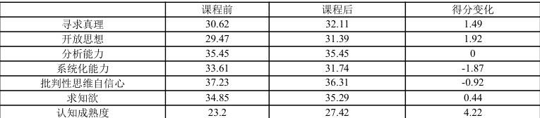 课程结束后,测得分析能力得分没有变化,但是批判性思维自信心有了0.92分的下降,系统化能力下降的更多,达到了1.87。经与学生座谈,发现学生认识到自身的知识层面、思维模式、思辨能力、观点产出与评价能力等与自己的期望均有较大的差距,因而对自己的评价有所降低。但这正说明,经过课程学习之后,学生对自身的思辨能力有了更为客观的认识。