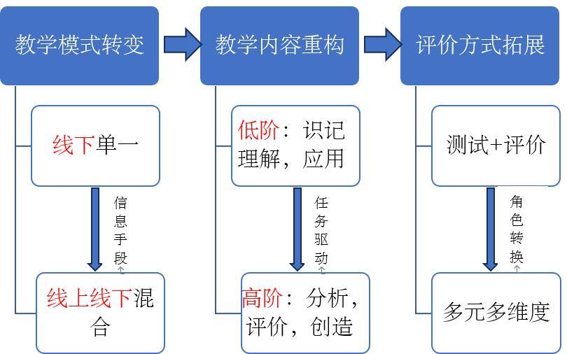 课程组重构教学内容,将低阶知识转为线上学习,使得课堂教学重点突出,有时间进行高阶思维训练,拓展了教学内容的深度。教学评价也因此发生了两个根本性的转变,一是由传统的对低阶知识的掌握程度的考查转变为高阶思维能力和问题解决能力的考查;二是由教师主导的评价转化为TSCA(师生合作评价),突出了教学评价中学生的参与度和主体性;三是加强了评价的信息化和日常化程度。